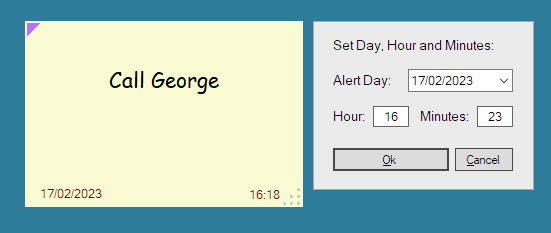 To set an alert in the current active sticky just set date and time later than the current one: when the set date will be reached or exceeded the sticky will automatically appear in the center of screen, eventually producing an additional sound.