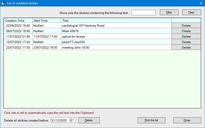 Are considered "outdated" all stickies where is set a date equal or below the current one, for example if them were used to write a quick note without changing the starting date. If these stickies are closed moving them outside one of the LATERAL EDGES of the monitor, them are saved to disk and can be displayed, until them are deleted, via the appropriate window, that can be opened: