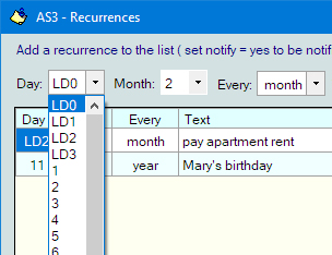 Note about LD dates: LD3 (for example) doesn't mean that the recurrence will be displayed three days before the deadline, but that the real date of every deadline during the year is the third to last day of the month. This means that if you set ( see checkbox 1 ) viewing notifications from two days before to the deadline day... the advice will be displayed five days before the last day od the month.