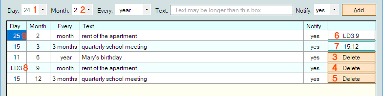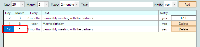 From the version 3.1 of the program you need to insert Day, Month, how many times them recur in a year (annually, semi-annuallyl, four-monthly, quarterly or monthly) and the related text.