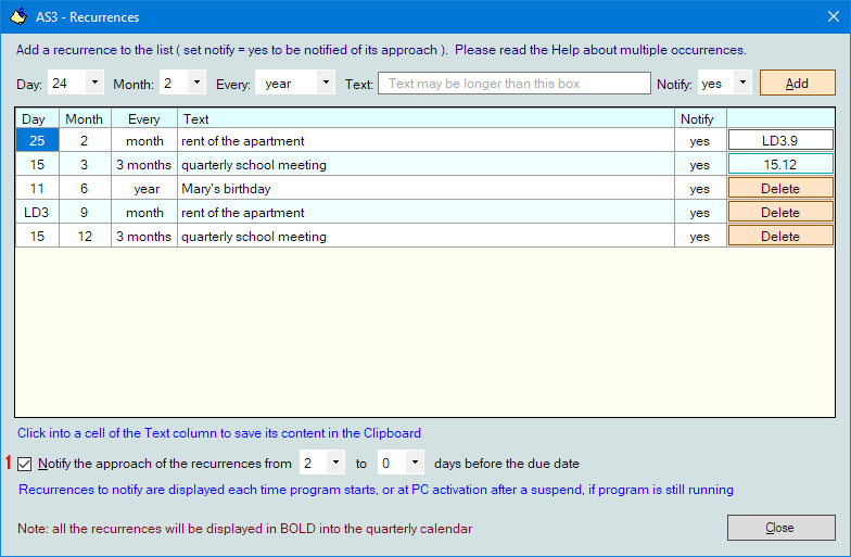 Recurrences saved with notification (and related check box selected) are then displayed through a Windows notification, for several days before them expiration date, in accordance with a programmable range of time, eg. from 3 to 1 days before the expiry date or from 2 to 0 days (where 0 days means the same expiration day) .