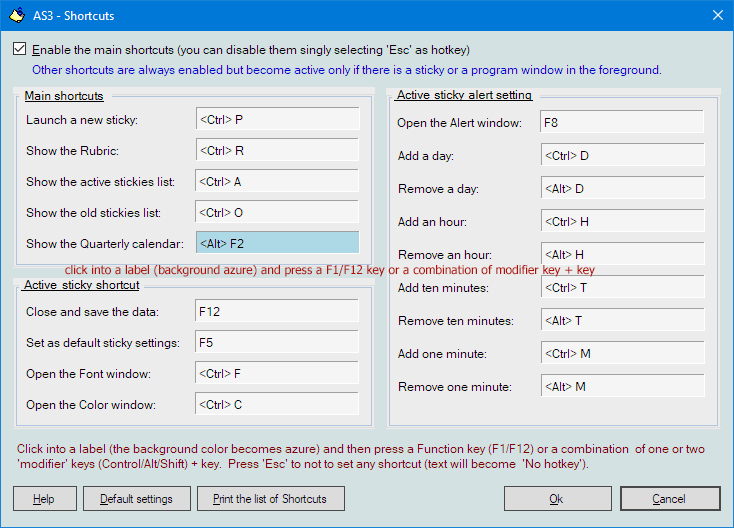 'To set a hotkey click into a label (the background becomes azure) and press the key combination you want.