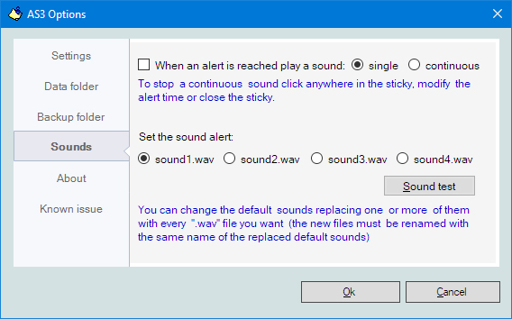 You can replace the 4 default sounds with any sound you want in ".wav" format. The default files (sound1.wav, sound2.wav, sound3.wav, sound4, wav) are located in the program folder (admin privileges required). Rename the new sound with the same name of the sound that you want to replace.