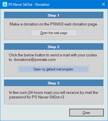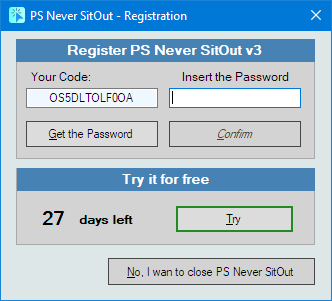 PS Never SitOut is a trialware program that can be used in all of its functions for 30 days. After this period in order to further use of the program is necessary to enter a password, which is sent within 24 hours after receiving a small donation.
